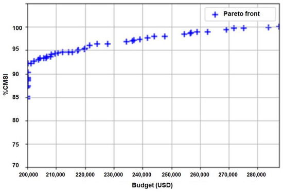 In this simulation, the average number of solutions in the Pareto Front obtained were 43 different non-dominated ones, which are shown in Figure 4. In Table 4, we can observe the first 10 optimal solutions that meet the budget criteria and %CMSI. The results show solutions with a %CMSI from 84.64% to 92.20, higher than the 80% required, with a budget close to USD 200,000.00. The final decision will depend not only on the highest CMSI% that the set of projects contributes, but also on the number of projects to be executed and other characteristics that the IT management can compare. If the IT management has the ability to influence the senior management to achieve a larger budget, it will be able to find better solutions, which have a CMSI% close to 100%.