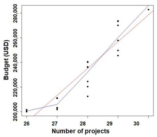 The correlation matrix in Table 5 shows the Pearson correlation values, which measure the degree of the linear relationship between each pair of variables, as well as the strength and direction of the relationship. All correlations were positive, meaning the two variables tended to increase or decrease at the same time. All variables had correlation values greater than 0.7; therefore, they are considered highly correlated. This correlation is reflected in Figure 4, Figure 5 and Figure 6, which show that the higher the budget, the greater the CMSI%; the higher the budget, the greater the number of projects to be executed; and the higher the CMSI%, the greater the number of projects to be executed.