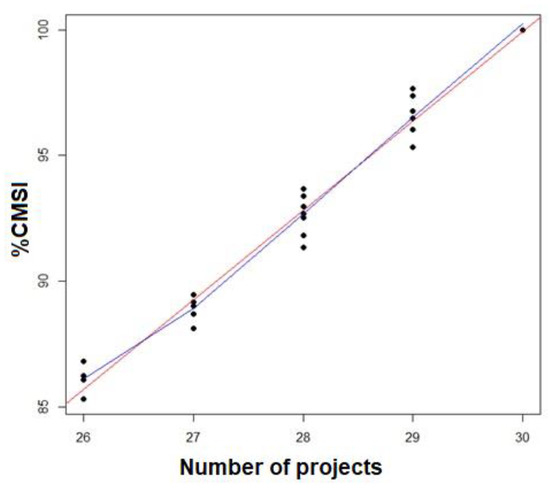 To analyze the relationship between the variables number of planned projects, cost of projects and CMSI%, we created scatterplots and Pearson’s coefficient [92,93,94].