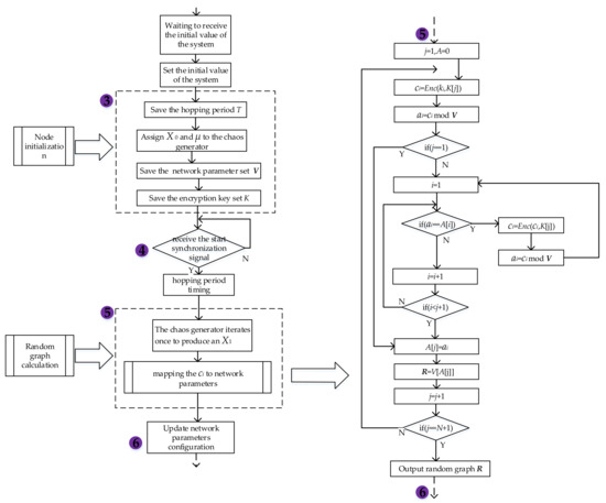 In order to address the shortcomings of fixed graph (R = (xij)z×n), we propose a random graph protection solution based on chaotic and cryptographic random mapping. The overall solution framework is shown in Figure 1 and consists of three parts: (1) system initialization; (2) random graph calculation; (3) update of network parameters. Firstly, the system initialization comprises the initialization of the total controller and nodes, including the assignment time period (T), the initial value (μ, X0) of logistic mapping, the initial value of the encryption algorithm (key sequence K = {k0, k1, ki,…, kθ}), and the set of candidate network parameters (V = {vi |0 ≤ I ≤ + Z}), as shown in steps ① and ③ of Figure 1. Next, the listener program is always listening and once the start synchronization signal is received, the hopping period (T − 0.1~T + 0.1) is started and timed while the random graph is being calculated, as shown in step ⑤.