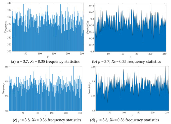 The chaotic nature of logistic mapping and the properties of finite precision implementations can produce degeneracy. Based on the characteristics of degeneracy of logistic mapping, the random properties of logistic mapping algorithms (LMAs) [25] and CandCRM schemes are compared. First, the initial values X0 = 0.38 and µ = 4.0 are set as the initial values of the LMAs and the initial values of the logistic mapping generator in the CandCRM scheme. Next, iterate through the LMAs and the logistic mapping generator 1 × 107 times, respectively. It should be noted that starting from the uneven results generated by the LMAs and the logistic mapping generator, the output values of the LMAs are modelled directly to V, from which the corresponding values are obtained through the modelling results. The values generated by the iterations of the logistic mapping generator are used as parameters of the encryption algorithm in the CandCRM, and the cipher text is encrypted with the parameters and processed into fixed-point numbers, and the fixed-point numbers are used to modulo V. The values are obtained from V through the modulo results. The statistical values are shown in Figure 11 and the results show that CandCRM is better balanced than LMAs.