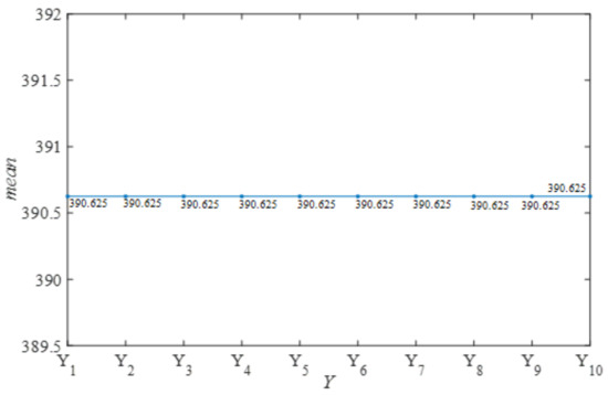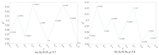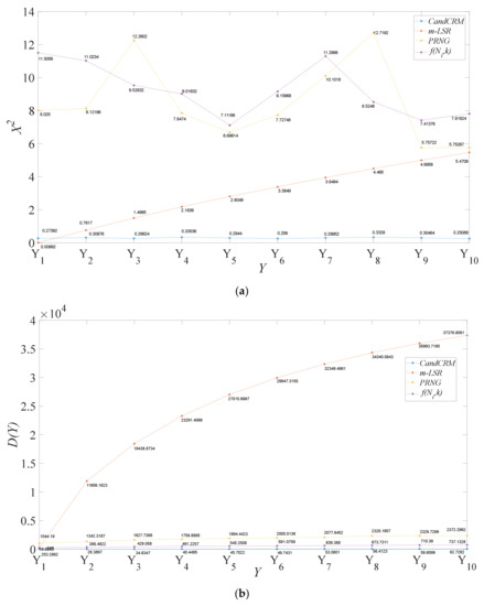 The equilibrium check is the most basic randomness check, and thus we use different control parameters to check the equilibrium of the results generated by CandCRM. The results of the balance check for Y (Figure 5) where the values of Y1(t), Y2(t), …, Y10(t) are much lower than the reference value of 3.841 for the initial values X0 = 0.35 and X0 = 0.36 and the control parameters μ = 3.7 and μ = 3.8, which indicates the balance effect of CandCRM well. In addition, we compare CandCRM with three other network parameter mapping methods, which are m-linear shift register (m-LSR) based on m-sequence [20,21,22], pseudo-random number generator (PRNG) [23], and function f(Ni,k) of the network parameter randomization method [24]. The experimental comparison results are shown in Figure 6. Compared with the remaining three methods, the method in this paper has obvious advantages in terms of balance.