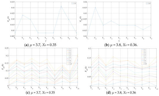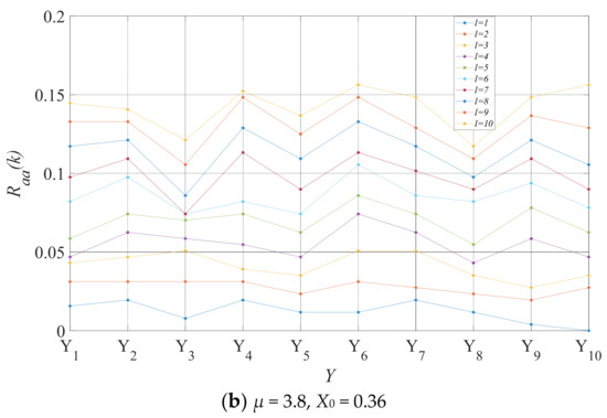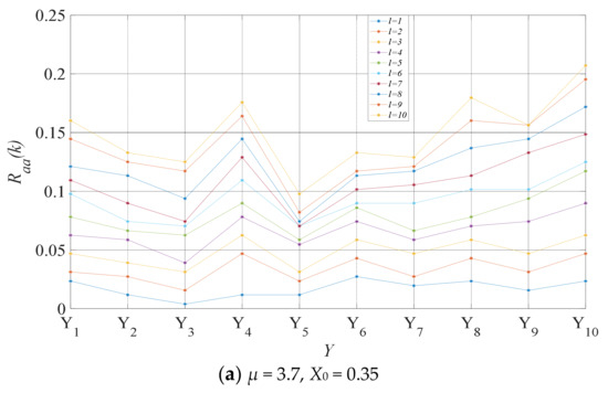 CandCRM complete 1 × 104 iterations to generate 256 network parameters (ri) for Y1(t), Y2(t), …, Y10(t), respectively, and to check the level of autocorrelation between these elements, we carry out an autocorrelation correlation check. As shown in Figure 9, the autocorrelation levels of these random variables are always below 0.15 for different initial values and different control parameters, indicating that they pass the autocorrelation test.