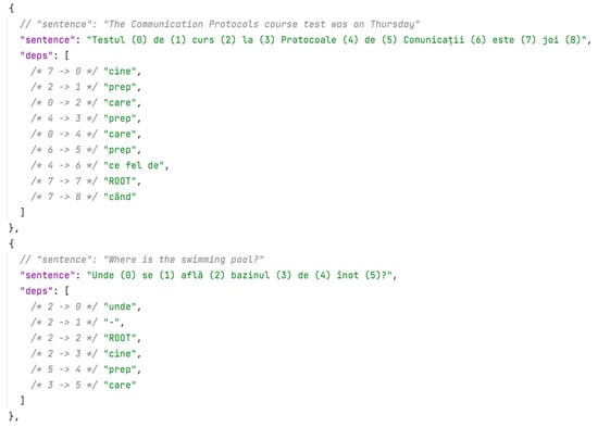| Sala laboratorului de PP este EG321. (Eng.: The PP laboratory room is EG321) | mem_assistant. store_attr | university_guide. find_room | 94.8 | Entities specific to the university guidance microworld (activity type: laboratory, classroom: “EG321”) |