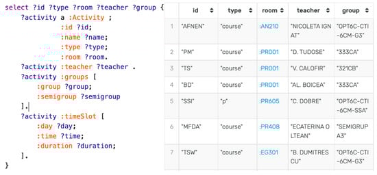 - Pérez, J.; Arenas, M.; Gutierrez, C. Semantics and complexity of SPARQL. Acm Trans. Database Syst. (TODS) 2009, 34, 1–45. [Google Scholar] [CrossRef]