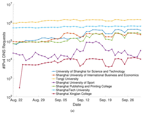 Internet users normally need the Domain Name System (DNS) to access Internet services [2]. As a representative Internet service provider (ISP) in China, China Education and Research Network (CERNET) offers DNS services to universities which are members of CERNET. CERNET DNS services support both IPv4 and IPv6 protocols. In particular, the Shanghai branch of CERNET offers Internet services for most universities in Shanghai, such as Shanghai Jiaotong University, Fudan University, and Tongji University. We obtained the DNS request log data provided by CERNET Shanghai from 21 August 2021 to 30 September 2021. Each DNS request included information on the university that sent the request, the domain name, CNAME record, A record, and AAAA record.