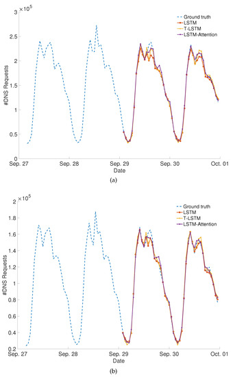 We used a long short-term memory (LSTM) network [43], which is often used in deep learning for temporal data prediction tasks. An LSTM network is based on the ordinary recurrent neural network (RNN) [44], which controls the transmission of information within the network by gating the state and retains the important temporal state in each pass-through step in a long-time memory manner to achieve better prediction results. An LSTM model is generally applicable to various types of continuous temporal prediction models, such as traffic flow prediction [45], network attacks prediction [46], and missing data compensation [47]. Considering the possible discontinuity of DNS data, an additional LSTM variant, time-aware LSTM (T-LSTM) [48], was chosen for comparison in this paper. T-LSTM improves the LSTM for irregular time intervals of time series data, capturing temporal features and burst features more effectively, and is often used for heartbeat prediction [49], disease prediction [50] and malicious account detection [51]. We also propose an LSTM-Attention prediction model, which combines LSTM and the attention mechanism, which can assign the data in different historical periods with different coefficients representing their influence on the prediction results [50,52].