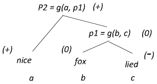 Approach of Recursive Neural Network Model, based on [41], predicting the sentiment classes of “Negative” (−), “Neutral” (0), and “Positive” (+). Sentiment classes in the figure are examples, not actual computed output.