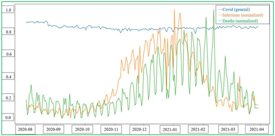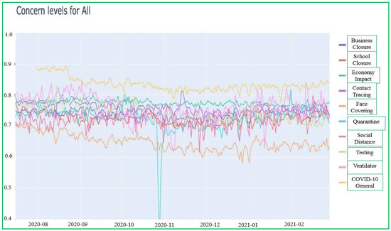 In addition, we plotted concern levels for each policy, and normalized values of COVID-19 cases and confirmed deaths over time. Figure 3 shows the trend visualization. There was little fluctuation of the concern level trend of COVID-19 (General) (shown as a blue line), while the normalized infections (orange line) and deaths (green line) fluctuated drastically between November 2020 and March 2021. Based on this information, we were not able to identify any meaningful correlation between the progress of the pandemic and the levels of citizen concern. We track and update the COVID-19 progress on a daily basis on our website (http://ai4sg.njit.edu/ai4sg/Covid, accessed 26 October 2022).