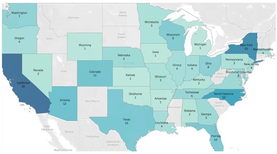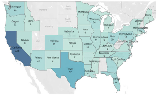 Over the whole period of data collection, we observed that states with large populations tended to fluctuate to a smaller degree than states with small populations. For example, in Wyoming, which has a population of 578,759, the concern levels between August 2020 and May 2021 varied widely: 0.91, 0.80, 0.82, 0.88, 0.83, 0.76, 0.97, 0.87, 0.76, and 0.93. However, these values were computed from small numbers of tweets. For example, the concern level of 0.93 for May 2021 is based on only 25 negative tweets. In comparison, for the same month, the concern level of California, which has 39.5 million residents, was 0.83, but it was based on 3963 negative tweets. Texas, which has 29.2 million people, had a comparable concern level to California of 0.84, based on 3712 negative tweets. The concern level of 0.97 in Wyoming, which was recorded in February 2021, is the highest observed in any state and any category. The lowest concern level was recorded in Minnesota as 0.68 for March 2021. Even though Minnesota, which has 5.7 million residents, is ten times more populous than Wyoming, this result was based on only 69 negative tweets. All these numbers are for “COVID-19 (General)”. For individual policies, values are notably lower.