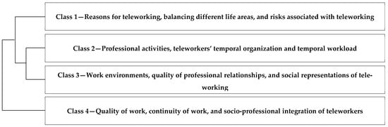 In the dendrogram (see Figure 1), we can see that Classes 1, 2, and 3 are very distant from (i.e., are very dissimilar to) Class 4. The first three classes focus on the nature of professional activities, tools, temporality, and the interconnection of professional activities (individual and collective) as well as the conditions for performing these activities. Instead, Class 4 focuses more on the results of activities and the risks inherent in working remotely.