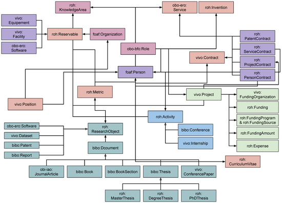 Figure 1 shows a graphical representation of the ROH classes and their main relations. We can observe that it models different entities, each of them represented by a color in Figure 1. For example, the entity research object is composed of a main class roh:ResearchObject and a set of subclasses such as vivo:Dataset, bibo:Patent, and bibo:Document. We provide a detailed explanation of each entity in the following points: