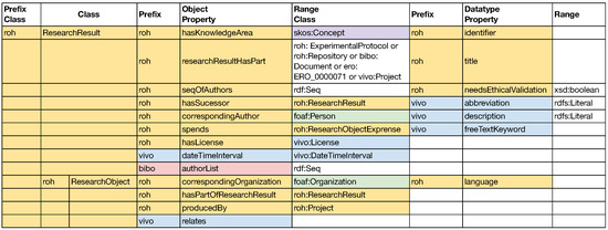 However, in the first versions of the ontology, when the knowledge graph construction process was carried out, the documentation was provided in a PDF file with tables. An example of how the documentation about the roh:ResearchResult class and its subclasses is provided is shown in Figure 2. This ad-hoc way of describing the ontology increases the difficulties of knowledge engineers to ensure the correctness of the mapping rules, hence compromising the quality of the constructed knowledge graph. For example, the documentation does not provide information about the meaning of the colors used in Figure 1 and Figure 2, so the knowledge engineer must spend time to understand their meaning. We suspect that, at least in Figure 2, the colors are used to refer to an extension or reuse of classes already defined in previous ontologies (e.g., light blue is used for the VIVO ontology [37]). To mitigate this risk, instead of relying on the documentation, we decided to use the source of the ontology (i.e., the OWL file) to generate a preliminary set of mapping template rules with a semi-automatic mapping generation tool, as we will explain in more detail in Section 4.