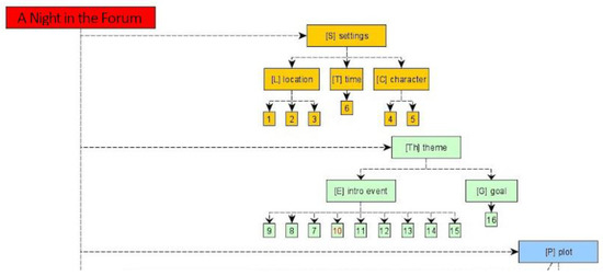 As such, crucial design insights were gathered from the fundamental study by Thorndike (1977) [4], which is still recognized as a valuable tool for strengthening memory recall in contemporary studies [8]. Ref. [4] analyzed content summaries performed by different participants who received the same, simple narrative story, but presented in different variants. The experiments suggested that “story comprehensibility and recall were correlated and were found to be a function of the amount of identifiable plot structure in the passages” [4] (p. 104). This study found that recall was higher for high-level organizational story elements, rather than lower-level details, and that recall was facilitated by the repetition of story structure, as repeating story content produced proactive interference. Based on these insights, and aiming to maximize memory and comprehension, we designed the game so that it unfolds through a main story (the frame) and secondary stories (episodes), connected to in-game specific tasks and discoveries. In this sense, the narratives of NiF were organized hierarchically (Figure 1), with all story elements explicitly structured in an effective order, following Thorndike’s theory [4] (p. 79).