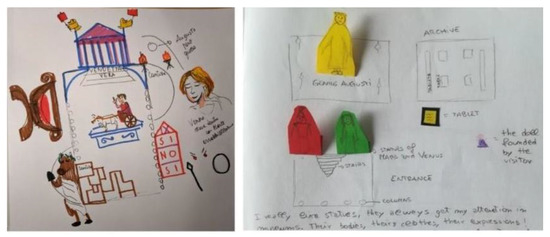 Looking at the map drawings (d), we noticed that all drawings were different from each other and that there were no significant differences in the groups (A,B,E) (Figure 4). We considered details, 2D and 3D elements, and comments involving aspects not related to the game. In 80% of the drawings, details were added, differing with regard to the typology (statues, tablets, columns); 60% contained written comments, including the name of the statues they recalled or objects found in the game. Only 20% reported personal comments, external to the game, While 80% tried to simplify and synthesize the experience, using 2D maps and including in them sketches of objects. There were no specific differences also considering players who had performed the focus exercise.