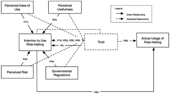 In general, using new sharing economy services through a digital platform as an intermediary provides various risks among its users, such as privacy concerns, flexible qualifications of service providers, and insufficient accident compensation processing []. These perceived risks have been a significant barrier to using new technology such as ride-hailing []. Most studies have investigated risk in ride-hailing from riders’ perspectives [,], but little from the drivers’ perspective. In the current pandemic crisis, it is crucial to consider that the adverse effects of COVID-19, such as lack of economic movement and unemployment, can lead to risk perception among ride-hailing drivers. For this reason, we are incorporating risk into TAM to understand further the role of risk upon ride-hailing usage among drivers in the occurrence of a pandemic. Regulations are critical in the ride-hailing industry because they produce a mechanism to control the industry, maintain the well-being of the drivers and vehicles, and provide appropriate compensation to those affected by accidents []. However, stringent regulations may lead to a diminishing number of drivers, which causes a price hike and more extended waiting periods for riders []. As an adequate number of drivers is significant in sustaining the ride-hailing ecosystem, it is vital to carry out empirical research to investigate the impact of governmental regulations on ride-hailing drivers’ intention to use the platforms. Thus, including governmental regulations in TAM introduces a new outlook on the technical factors that affect new technology usage, such as ride-hailing. Moreover, trust is fundamentally a critical determinant of ride-hailing services among riders [,]. When riders trust ride-hailing services, they intend to continue using them. However, prior studies have shown mixed views in the context of trust in the platform, partners, and user intention in the sharing economy [e.g., [,]. Hence, this study investigates the role of the trust itself and its mediating effect on the relationship between perceived technology, perceived risk, and government regulations towards drivers’ intention to be a supplier.