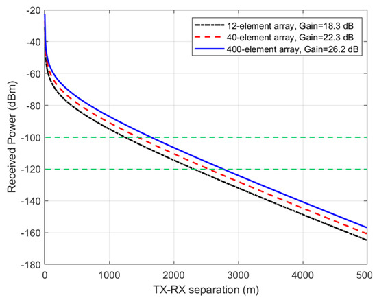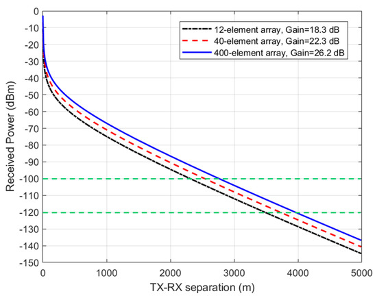 The performance metrics explored for measuring communication secrecy in this paper is the TX-RX range for which eavesdropping is no longer possible. Next, we examine the range of secure communications between TX and RX that is achievable when using the beamforming arrays shown in Figure 5, Figure 6 and Figure 7. We assume typical 5G user equipment (UE) with a transmitted power of 23 dBm (or 200 mW) [17], a base station (BS) with a transmitted power of 43 dBm (or 20 W) [18], and a receiver sensitivity of −100 dBm (or 0.1 pW), considered the same for both the BS and UE, for simplicity. Thus = 0.001 pW = −120 dBm. The Stanford University interim (SUI) model was assumed for the path loss model (terrain type A or hilly/dense vegetation) [18], and water vapor absorption of 14.6 dB/km for the 60 GHz band shown in Figure 1 was added to the terrain-specific path loss. Figure 8 displays the received power as a function of the TX-RX separation distance, when a UE transmits 23 dBm (200 mW) power at 60 GHz using the antenna arrays in Figure 5, Figure 6 and Figure 7 corresponding to antenna gains of 18.3, 22.3, and 26.2, respectively. It can be observed from this figure that the useful transmission range for of −100 dBm is roughly 1.5 km, while the maximum intercept range for 0.01 of −120 dBm is roughly 2.5 km. Figure 9 displays the received power as a function of the TX-RX separation distance, when a BS transmits 43 dBm (20 W) power at 60 GHz using the antenna arrays in Figure 5, Figure 6 and Figure 7 corresponding to antenna gains of 18.3, 22.3, and 26.2, respectively. It can be observed from this figure that the useful transmission range for of −100 dBm is roughly 2.5 km, while the maximum intercept range for 0.01 of −120 dBm is roughly 4 km. These results are important technical contributions. They provide useful guides on the range of secure transmissions that are possible when deploying IoT devices employing beamforming arrays at 60 GHz, assuming that one is operating within contemporary TX and RX parameters stipulated in 5G cellular networks.