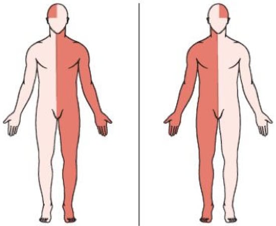 Hemiplegia is a disease that causes the patient to lose motor control in one part of the body. The hemiplegia symptoms include the patient’s inability to move its right or left body parts (arm and leg) and the creation of spastic mass patterns. The paralysis in half of the patient’s body is usually caused by a stroke and has severe consequences on their health and quality of life. It is an effect caused by damage in one of the two cerebral hemispheres. The problems caused by a brain lesion in one area are spread to other areas since the human brain is an extensive network of interconnected neurons participating in two different types of communication (feed-forward and feedback). The unaffected areas of the brain face problems due to the lack of information or misinformation created from the affected areas. The stroke patient will have to deal with severe problems in both body sides, with side effects spreading to all brain functions causing motor impairment in the whole body. These impairments will affect sensory perception, memory, and behavior, causing a challenging situation to the patient’s rehabilitation process. Hemiplegia types can be right or left, as seen in Figure 1. In the former type, the left body side is paralyzed, while in the latter type, the right body side is paralyzed. An example causing either type is an incomplete spinal cord injury [,].