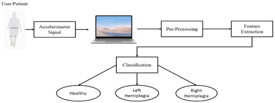 The above six features formed the feature vector sent as input to a neural network trained with the LM-BP algorithm. The motivation behind selecting those features was the reduction of the initial large dataset to a smaller dataset that can be easily transferred and processed with a low-cost credit card type computer like Raspberry Pi Zero W. Moreover, the above feature combination achieved the highest classification accuracy over alternative ones containing different feature sets. The neural network classified the input data into three classes (healthy, left, or right hemiplegia). The data were taken from a custom-created dataset divided into training, validation, and a separate test set. The k-fold cross-validation method was utilized in the training and validation sets. A visualization of the proposed system can be seen in Figure 2.