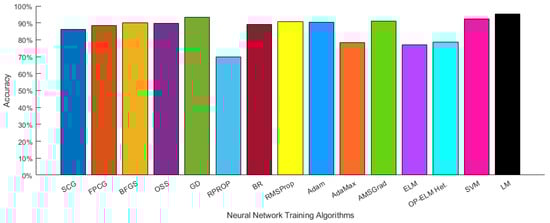 Experimental results plot. The proposed LM-BP-based system achieved the highest accuracy compared to fourteen existing machine learning algorithms.