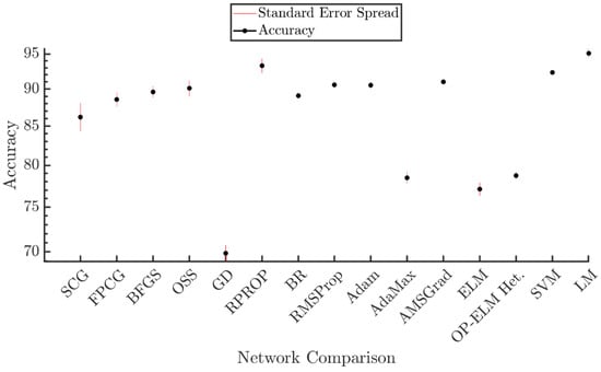The data classification task is a critical part of the LM-BP-based system presented in this article. A few typical BP-based machine learning methods for this task are described below. The SCG-BP training algorithm by Møller [] is a variation of the original backpropagation (BP) algorithm which utilizes a Levenberg-Marquardt approach for the elimination of the computationally-intensive line search [,]. Fletcher-Powell conjugate gradient BP (FPCG-BP) is a conjugate gradient-based approach that utilizes the Fletcher-Reeves updates to update the weights and thresholds []. The Broyden, Fletcher, Goldfarb, and Shanno backpropagation (BFGS-BP) method is a quasi-Newton approach for unconstrained optimization problems which utilizes updating formulas for the Hessian approximation []. The one-step secant backpropagation (OSS-BP) algorithm fills the gap between the conjugate gradient approaches and the quasi-Newton algorithms. One-step secant assumes that the previous Hessian is the identity matrix at each epoch. This assumption has the advantage that the new search direction can be calculated without the help of the matrix inverse, which makes it require less storage space and is faster than the BFGS method []. Gradient descent (GD) is an iterative optimization algorithm that utilizes first-order derivatives to find a local minimum of a differentiable function []. A major issue with gradient descent, when used to train a multi-layer network with a sigmoid transfer function, is that the gradient has a very small magnitude that causes small changes in the weights and thresholds, which slows down the training process. Resilient propagation (RPROP) was developed to solve the above problem and works by using a local adaptation of the weight updates following the error function’s behavior []. The Bayesian regularization backpropagation (BR-BP) algorithm modifies and minimizes a linear combination of squared errors and weights. The purpose of the resulting network is to achieve good generalization performance [,]. Root mean squared propagation (RMSProp) [] extends gradient descent and the AdaGrad version of gradient descent. It utilizes a decaying average of partial gradients to adapt the step size in each parameter. The Adam optimizer [] is a first-order gradient-based optimization method for stochastic objective functions which utilizes adaptive estimates of lower-order moments. The AdaMax [] algorithm is an extension of Adam based on the infinity norm. The adaptive gradient (AdaGrad) algorithm [] scales the learning rate parameter for each dimension in an adaptive manner to certify that the training process is not too slow and not too volatile and imprecise.