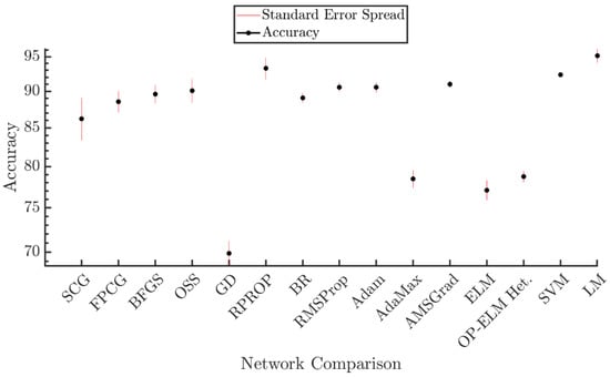 Statistical analysis of the results using a 95% CI. It can be seen from this figure that there is no overlap between the LM-BP algorithm and the other approaches, which is a strong indication that the results from the proposed method are statistically significant. One exception is the RPROP method, which overlaps with the LM-BP algorithm, which doesn’t allow any conclusion regarding the statistical significance between the two methods.