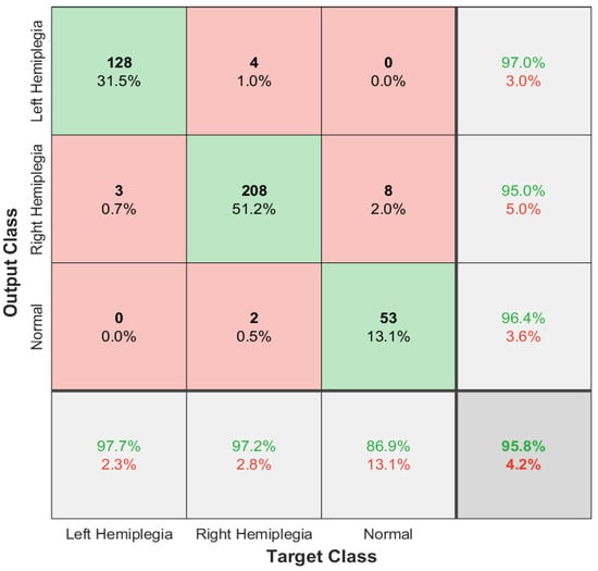 The LM-BP algorithm achieved a very high accuracy (95.8%). The number of test samples introduced to the network was 406 (132 for left hemiplegia, 219 for right hemiplegia, and 55 for non-patients). Each row defined the classification output of the network where the green boxes corresponded to correctly classified samples while the red boxes corresponded to incorrectly classified ones. The white box at the end of each row defined the percentage of all the samples predicted to belong to each class that was correctly (green color) and incorrectly (red color) classified. Each column defined the target class where the green boxes corresponded to correctly classified samples while the red boxes corresponded to incorrectly classified ones. At the end of each column, the white box defined the percentage of all the samples that belonged to each class and was correctly (green color) or incorrectly (red color) classified.