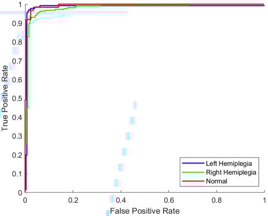 The next figure depicts each class’s receiver operating characteristic (ROC) curve. A ROC curve is a graphical plot describing the trade-off between true positive rate (sensitivity) and false positive rate (1–specificity). If the curve is very close to the top left corner, it is an indication that the classifier has very good performance. On the other hand, if the curve is very close to the 45-degree diagonal of the ROC space, it indicates poor classification performance. All the curves in Figure 7 are very close to the upper left corner, and they have the area under the curve (AUC) values 0.9851 (left hemiplegia), 0.9772 (right hemiplegia), and 0.9919 (normal). Both observations show that the classifier has excellent classification performance (AUC values between 0.9 and 1 indicate an excellent performing classifier).