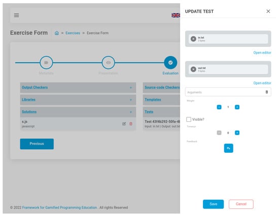 Each resource field of the form (e.g., test) has an associated sidebar where the author can enter its information (e.g., weight, arguments, and feedback messages) and upload related files (e.g., input and output text files).