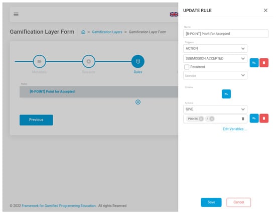Screenshot of FGPE AuthorKit while editing a rule on the gamification layer wizard.