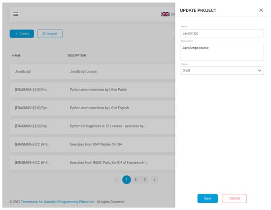 The user interface organizes programming exercises and gamification layers inside projects. Projects can be created and modified directly from the dashboard, which contains a listing of the projects, through a toggleable sidebar as shown in Figure 4. The sidebar form lets the user enter meta-information about the project, such as the name, description, status, and availability. Within a project, the user can see the listing of both the collection of programming exercises and gamification layers.