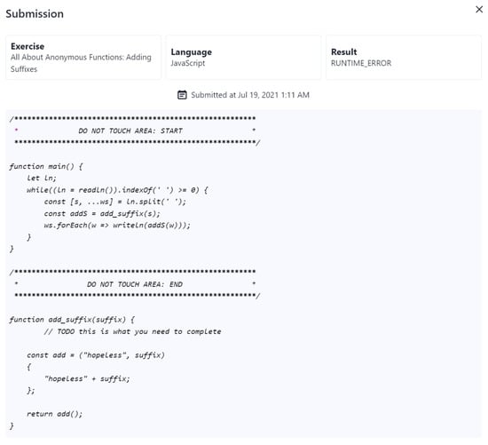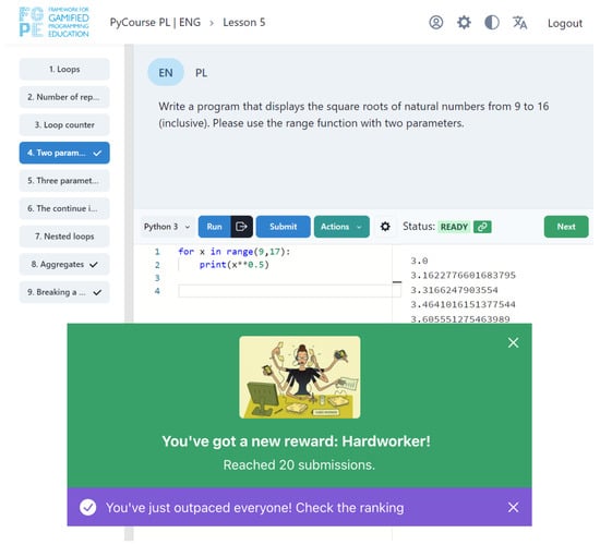 Feedback is considered as one of the three high-level concepts (together with competition and cooperation) essential for gamification []; however, even apart from gamification, it has been considered for a long time as an important element of successful knowledge and skill acquisition [,]. In programming education, fortunately, instant feedback can be generated automatically based on the submission code, providing the student with relevant information about general concepts, task constraints, mistakes made, hints on how to proceed, or even meta-cognition [].