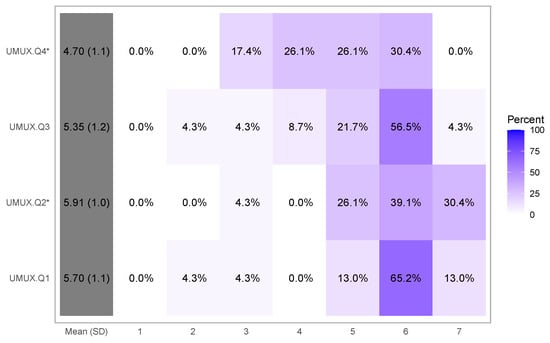 Figure 8 depicts the results in a percentage heatmap, with values, average, and standard deviation per question. From a visual perspective, it is clear that the direction of response for all variables is towards the degree of somewhat agree (5), agree (6), and strongly agree (7), which means that the measurement of the variable is acceptable []. For instance, UMUX.Q2* has a mean close to agree (6), whereas the others have means greater or close to somewhat agree (5). The lowest mean is 4.7 for question UMUX.Q4*.