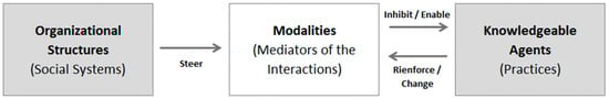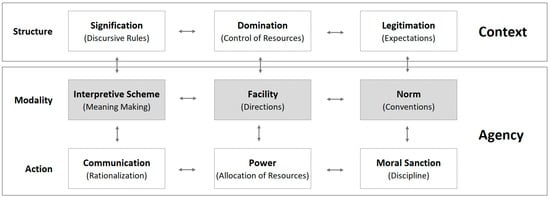Structuration Theory—interactions between structures, modalities and actions. Adapted from Giddens [1].