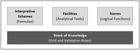 The focus of this article is on revealing how the capabilities and features of spreadsheet applications, the ‘properties’ of spreadsheets, make them reconfigurable tools for representing structures in different contexts. In the analytic process, spreadsheet design practices are identified that constitute and technically work as Giddens’ three structural modalities of power, as discussed earlier. These roughly translate as: (1) construction of interpretative schemes for meaning making and rationalizing courses of action, (2) exercise of authoritative power for automated decision making and application of resources, and (3) enactment of moral sanctions and social norms to discipline people’s work. The three modalities are viewed as overlapping and reinforcing layers or dimensions of structure supported by a ‘stock of knowledge’ that is constructed using the fundamental gridmatic architecture of spreadsheets and certain common spreadsheet properties and design practices.