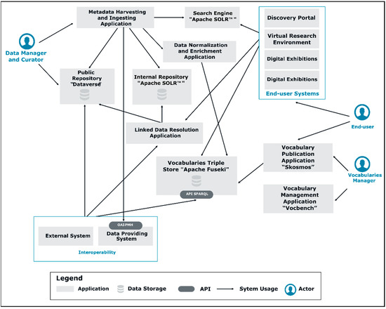- Vocabularies Management Application (Vocbench)—By using this application, the Vocabularies Manager creates and maintains the controlled vocabularies of the ROSSIO infrastructure. It is a deployment of the Vocbench (http://vocbench.uniroma2.it/ accessed on 7 December 2021) software;