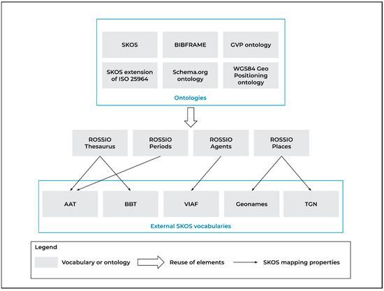 Figure 2 provides an overview of the ROSSIO Vocabularies. These vocabularies are modelled in SKOS [12], the W3C recommendation for modelling knowledge organisation systems (KOS) and sharing them as linked data. It should be noted that name authority lists and gazetteers are also KOS [13]. While SKOS was designed for modelling thesauri-like resources with hierarchical and associative concept relations [14], we have also applied it in modelling vocabularies of agents and places, in line with many other linked data initiatives (e.g., the Getty Vocabularies Program, which includes vocabularies of artists and geographic names modelled in SKOS (https://www.getty.edu/research/tools/vocabularies/ accessed on 7 December 2021)). This option has the advantage of enabling the use of tools that are already in production within ROSSIO, namely, VocBench and Skosmos, for publishing these vocabularies as linked open data.