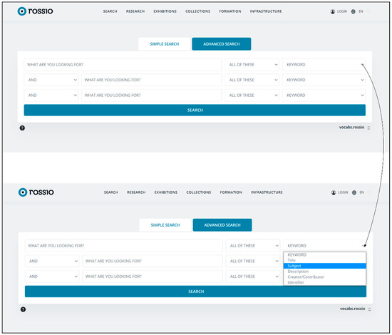 The discovery portal will provide many search options—including simple and advanced searches—of the digital resources located in the different consortium institutions and content providers (Figure 3). For example, the advanced search option will provide more concrete results, which are enriched with controlled vocabularies and filters. As in the cases of the DPLA and Library of Congress, this function will prove instrumental for different users, especially within the research community [18], by providing more precise results while fostering new approaches based on the connections between the discovered items. Moreover, it should be noted that the discovery portal is the core of the ROSSIO Platform since all other services are highly dependent on its successful implementation.