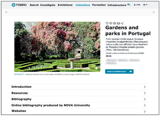 Other services provided by the platform are exhibitions and digital collections, generally defined as activities that aim to present and develop a given subject by using hypermedia—texts, audio, graphics, images, and video—and digital resources disposed according to a predetermined and accessible narrative. This service was developed by taking into account the studies and reflections developed by authors such as M. Kalfatovic [19], C. Leong [20,21], M. T. Natale [22], and A. Antoniou [23], as well as other relevant international cases. For instance, ROSSIO’s team was careful to distinguish digital exhibitions from other similar and very common initiatives, such as photo galleries, by introducing a contextualising narrative. Furthermore, we can apply different storytelling techniques, such as transforming the exhibitions titles and their subsections into clear questions that could arouse the user’s curiosity. The exhibition’s narrative adopts a clear and direct language, as well as a predetermined limit of characters to be used in order to retain the user’s attention. The scientific curation of exhibitions and collections will be assured by ROSSIO’s researchers in collaboration with renowned experts.