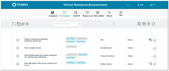 - Share—For sharing with other users the resources and personal notes on them, increasing the collaborative work and the community of practices [24,25,26].