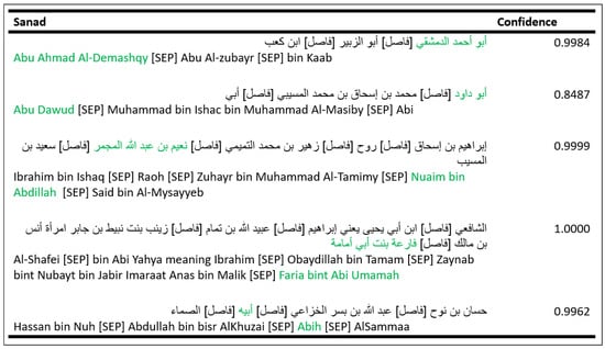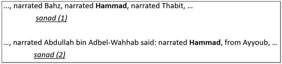 Notice that we use a standard separator, [فاصل], and not the narration terms that usually appear in real hadiths such as the hadith in Figure 1. Some examples of narration terms are: narrated, said, mentioned, heard, etc. Extracting narrator names from sanads is another topic discussed by many works [27,28,29,30,31,32], but it is not in the scope of our paper. Those narration terms do not help the identification process.