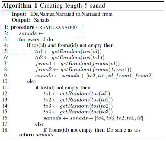 We introduce a new dataset that contains 279,625 artificial sanads. Artificial sanads are similar to real sanads but are created by making different combinations of narrators who narrated from each other. Each narrator in those sanads is tagged with an ID to disambiguate his name. More details on the creation process is in Section 3.1. The artificial sanads are created using narrators’ data collected from hadith books and narrators’ biographies that are made available in digital format at “عبد الله بن عبد العزيز للسنة النبوية المطهرةجامع خادم الحرمين الشريفين الملك”, the Custodian of the Two Holy Mosques for the Prophetic Sunnah. We refer to it as Khadem Al-haramayn website (https://sunnah.alifta.gov.sa/, accessed on 10 November 2021). This website was launched by الرئاسة العامة للبحوث العلمية والافتاء, the General Presidency of Scholarly Research and Ifta.