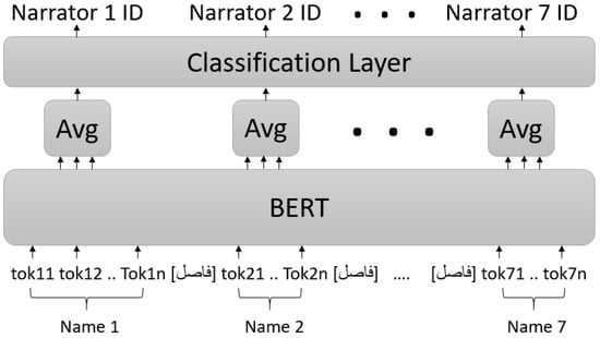 We use AraBERT to get a vector representing each narrator in the sanad. We do this by averaging tokens embeddings of the narrator name. Then, we feed this vector to a classification layer to determine the identity of the narrator. Figure 5 illustrates this process.