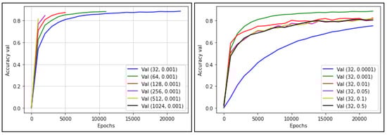 Training with different hyperparameters. On the left are the training curves with different batch sizes and learning rate of 0.001. On the right, different learning rates and batch size of 32.