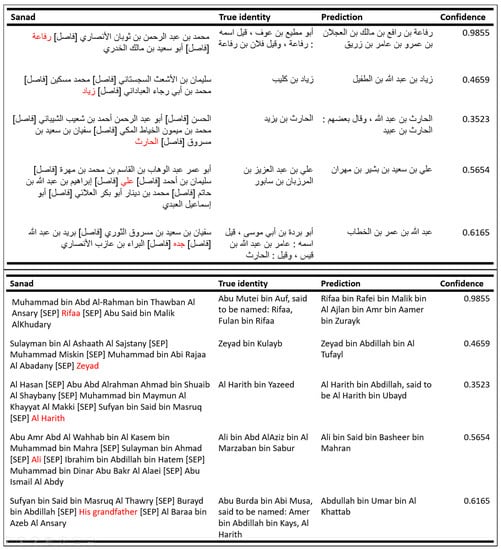 Figure 8. Examples of false predictions for narrators marked in red, their true identity, the false identity predicted by the model and the model’s confidence in the prediction.