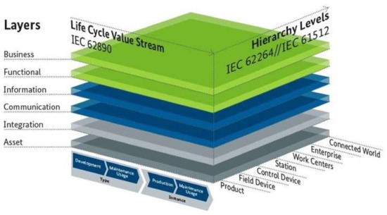 In April 2013, Plattform Industrie 4.0 was officiated by the German Federal Minister of Economics and Federal Research Minister. Together with its alliance, consisting of companies, academia, associations, and trade unions, they published a reference framework with the German Electrical and Electronic Manufacturers’ Association (ZVEI), called Reference Architectural Model Industrie 4.0 (RAMI 4.0), in 2015 [4,5], followed by DIN SPEC 91345 by the European Standards in 2016 [6], as guidance for Industry 4.0 implementation. Plattform Industrie 4.0 was established to focus on the strategic Industry 4.0 development in order to enable the organization and control of the entire value chain along the product lifecycle. The use of relevant technologies allows the lifecycle to orient itself by fulfilling the increased individual customer requirements.