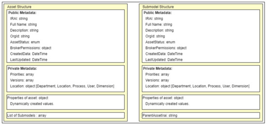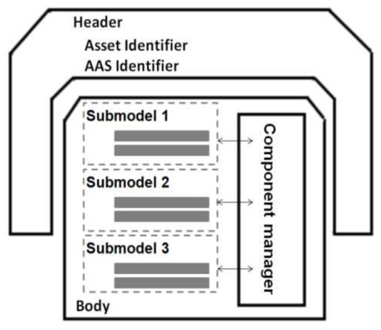 The AAS is made of a series of submodels [31]. It is composed of a body and a header. The header contains identifying details regarding the AAS and the represented assets in reality. Figure 3 shows a general structure of AAS. The body contains a number of sub-models that specify the characterization of the AAS, such as security, its process capabilities, and connection. Each submodel contains a structured quantity of properties that can connect to data and functions that may reside in other locations and be in various complementary formats.