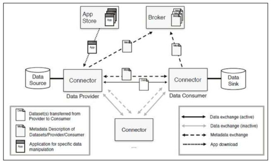- Trusted Connector. This component is a service in the IDS that allows data to be kept in a container, such as asset data and sensor data, to be processed and transferred to the other party (see Figure 5). The trusted Connector has to work together with the Broker to enable communication between a Data Provider and a Data Consumer.