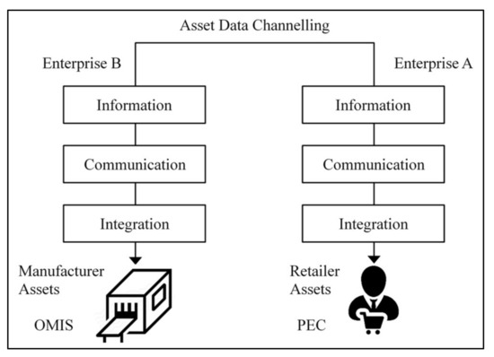 This section describes the design of the data exchange ecosystem that enables the mass individualized production of bottled mixed juice. A proof-of-concept (POC) is developed to demonstrate the architectural design and functions that enable vertical and horizontal value-chain integration, as shown in Figure 6. In this POC, PEC represents the e-retailer who provides an online ordering system to the end customers, and OMIS represents the manufacturer who produces the individualized bottled juice. They represent both data provider and data consumer in the data exchange ecosystem. To enable secured and trusted data exchange, OMIS is required to navigate through the ABM Portal and subscribe to the PEC’s assets. The value chain connectivity architecture for the asset data channeling is shown in Figure 7. To ensure the sovereignty of asset data, the data access control is managed by individual enterprises, such as to control who can access the information, when to enable the data channeling, and to set the data availability duration. The access control information is added to the information object and data model using JSON, managed in the Information Layer. The Information layer is also responsible for maintaining the connectivity between the shop floor components and establishing secure communication with other enterprises in the value chain. A use case to simulate the value chain connectivity between OMIS and PEC is developed to demonstrate the communication and integration of assets (or components) from the Asset Layer to the Information Layer.