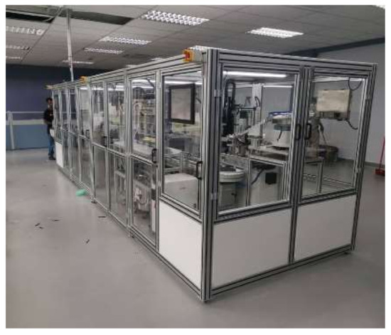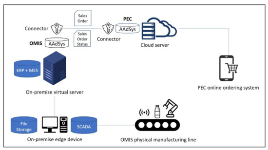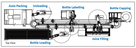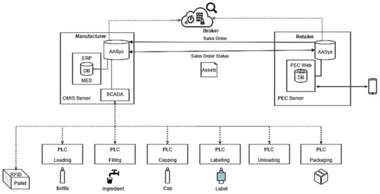 OMIS, an acronym of One-Piece Manufacturing through Individualization Solution, is a manufacturing line for individualized mixed-juice production. The overview of the OMIS vertical and horizontal integration architecture is shown in Figure 9. OMIS represents the manufacturer that manufactures individualized products based on the “Sales Orders” asset received from PEC. The Enterprise Resource Planning software (ERP) manages the sales order received from PEC, the production schedule is managed by the Manufacturing Execution System (MES), and the manufacturing automation is managed by SCADA. Each station is controlled by a PLC. As shown in Figure 10, the OMIS manufacturing process involves six stations, i.e., loading, mixing, filling, capping, printing, and packaging. The product, i.e., the bottled juice, is traced using RFID, and the field devices (sensors) that produce real-time production data are recorded in the control device (PLC) at each station. At the end of the production, the data regarding the entire work center, i.e., the individualized mixed-juice manufacturing line that comprises six stations, are channeled back to MES via SCADA. The “Sales Order Status” asset is sent to the ERP and channeled back to PEC via AAdSys. This sales order status is important for PEC to update its customers that their orders are completed and ready for collection or shipment. Figure 11 shows the physical view of the actual OMIS manufacturing line.
